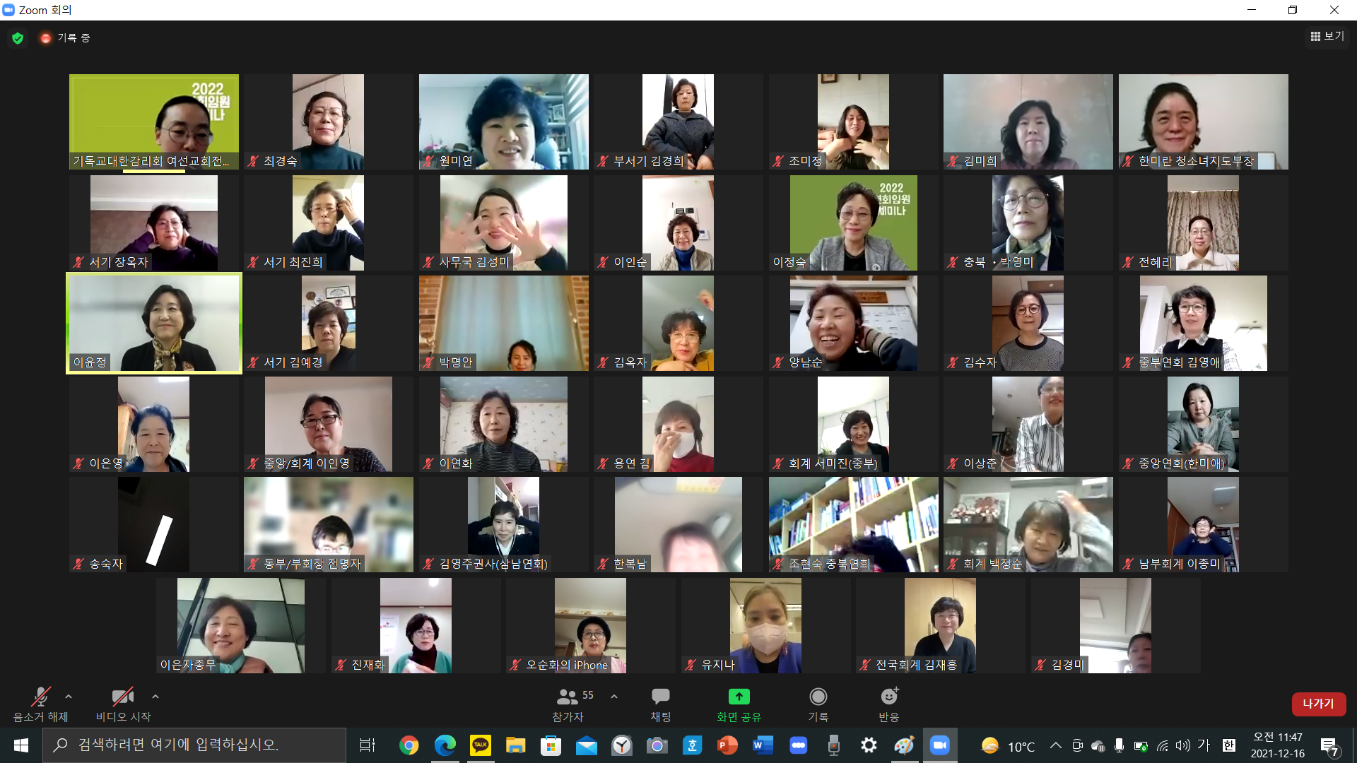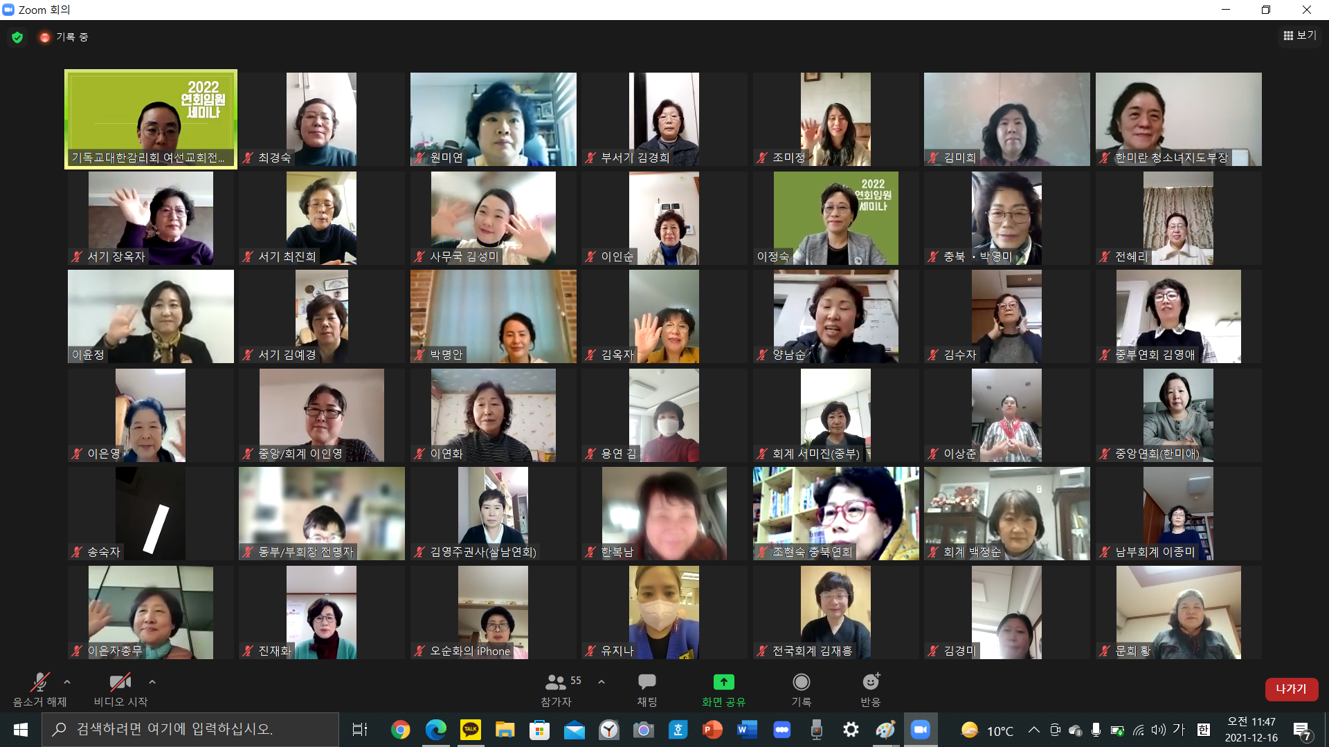 새로운 임기를 맞이하는 연회 임원들의 세미나가 지난 12월 16일(목)~17일(금)에 온라인(ZOOM)으로 진행되었습니다. 온라인 세미나에서는 이정숙 회장의 ‘행동하는 신앙, 되살아나는 우리’를 주제로 한 2022 비전 선포를 시작으로, 여선교회 브랜드 가치 상승을 위해 연회 임원으로서 돌아봐야 하는 것이 무엇인지에 대해 이윤정 총무(여선교회전국연합회)의 강의가 진행되었습니다. 공통강의 후에는 직능별, 부서별 소그룹으로 모여 관련 사업을 공유하고 토론하는 시간을 가졌습니다. 2022년 새로운 다짐으로 연회를 더욱 굳건하게 다져나가서 여선교회의 사업이 더욱이 단단해지도록 함께 기도함으로 마무리했습니다.