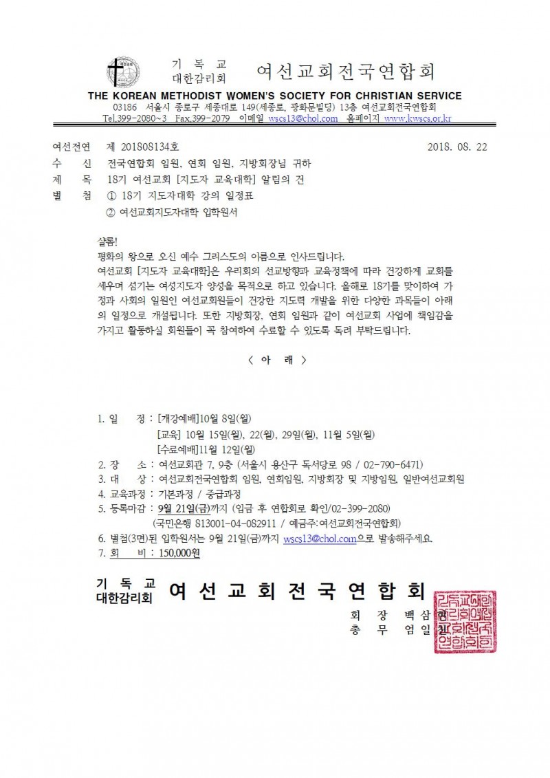 2018년 여선교회 지도자교육대학 최고지도자과정 알림의 건
